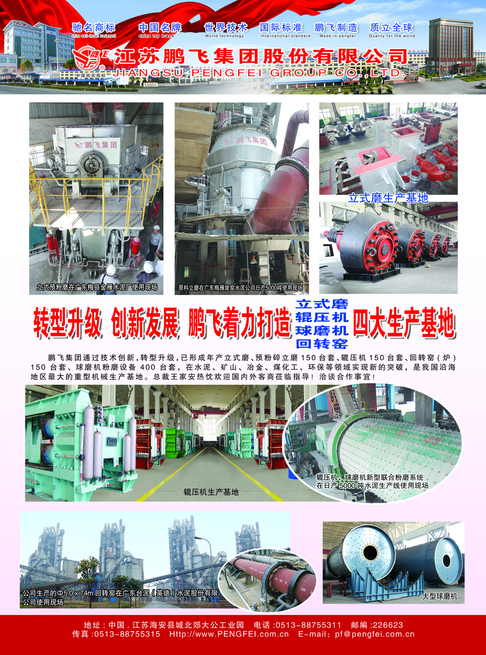 鵬飛集團(tuán)通過技術(shù)創(chuàng)新,轉(zhuǎn)型升級,已形成年產(chǎn)立式磨、預(yù)粉碎立磨150臺套、輥壓機(jī)150臺套、回轉(zhuǎn)窯(爐)150臺套、球磨機(jī)粉磨設(shè)備400臺套,在水泥、礦山、冶金、煤化工、環(huán)保等領(lǐng)域?qū)崿F(xiàn)新的突破,是我國沿海地區(qū)大型重型機(jī)械生產(chǎn)基地。總裁王家安熱忱歡迎國內(nèi)外客商蒞臨指導(dǎo)!洽談合作事宜!