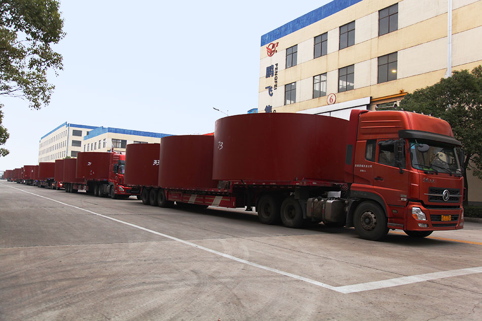 11月21日江蘇鵬飛集團股份有限公司內(nèi)一片忙碌,工人師傅們?yōu)槌隹贏J5臺Φ5.4×52米回轉(zhuǎn)窯發(fā)貨做著準備。公司經(jīng)過數(shù)月的加班加點終于保質(zhì)按期完成5臺Φ5.4×52米回轉(zhuǎn)窯制造。