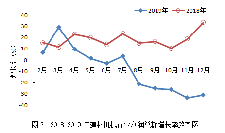 2019年,建材機(jī)械行業(yè)累計(jì)實(shí)現(xiàn)利潤總額36.57億元,同比下降31.00%,增速較上年同期回落64.26個百分點(diǎn),落后于建材工業(yè)(15.6%)、機(jī)械工業(yè)(-4.53%)的增速,遠(yuǎn)低于建材機(jī)械相關(guān)領(lǐng)域工程機(jī)械(16.48%)、重型礦山機(jī)械(21.65%)增速。從增速變化趨勢看(見圖2),全年利潤總額增速下行態(tài)勢明顯,且與上年相比回落較大,降幅最高達(dá)64.26個百分點(diǎn)。