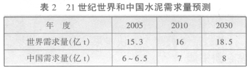 21世紀(jì)世界和我國水泥的生產(chǎn)與消費(fèi)仍將保持一定速度增長,但不是很高。表 2 是世界和中國水泥需求量的預(yù)測(cè)。