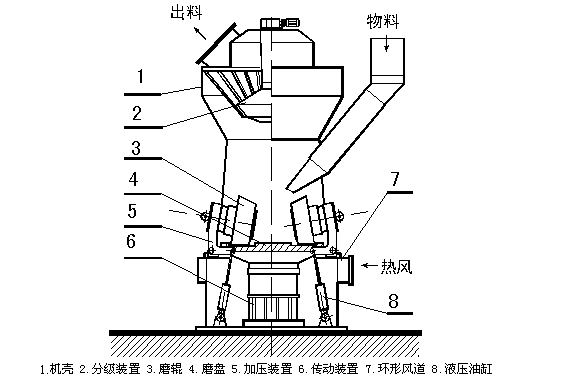 2.氣體流程:熱風→立式磨→旋風收塵器→1號排風機→袋收塵器→2號排風機→排空。 循環(huán)風(余熱利用)