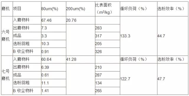 2、同時對六七號磨機的入磨物料、出磨物料、選粉機回粗、B收塵的物料、水泥成品、在磨機運轉正常的情況下進行取樣,做80um、200um、及比表面積以計算磨機的循環(huán)負荷和選粉機的選粉效率。測量結果見下表: