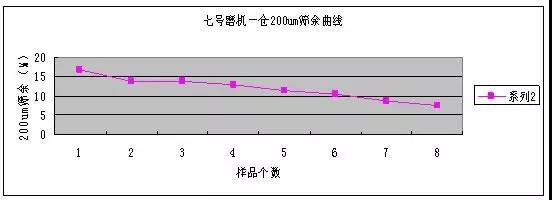 (1)從以上的兩個趨勢圖可以看出七號磨機的一倉粉磨能力還可以,特別是200um的篩余趨勢圖,篩余下降明顯。說明一倉鋼球級配和理粉磨能力正常。